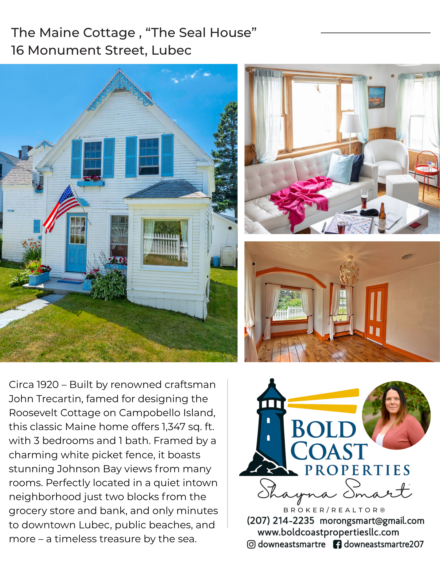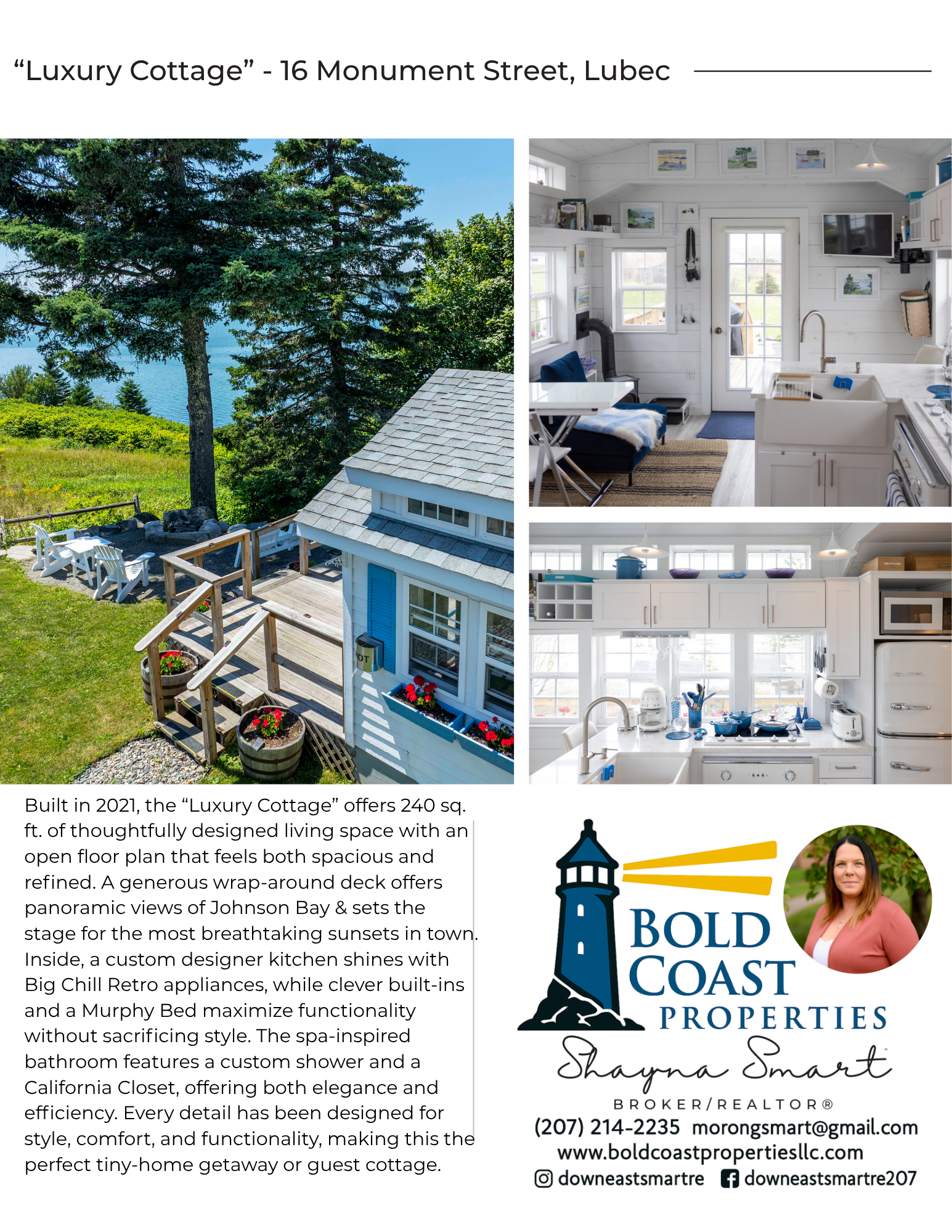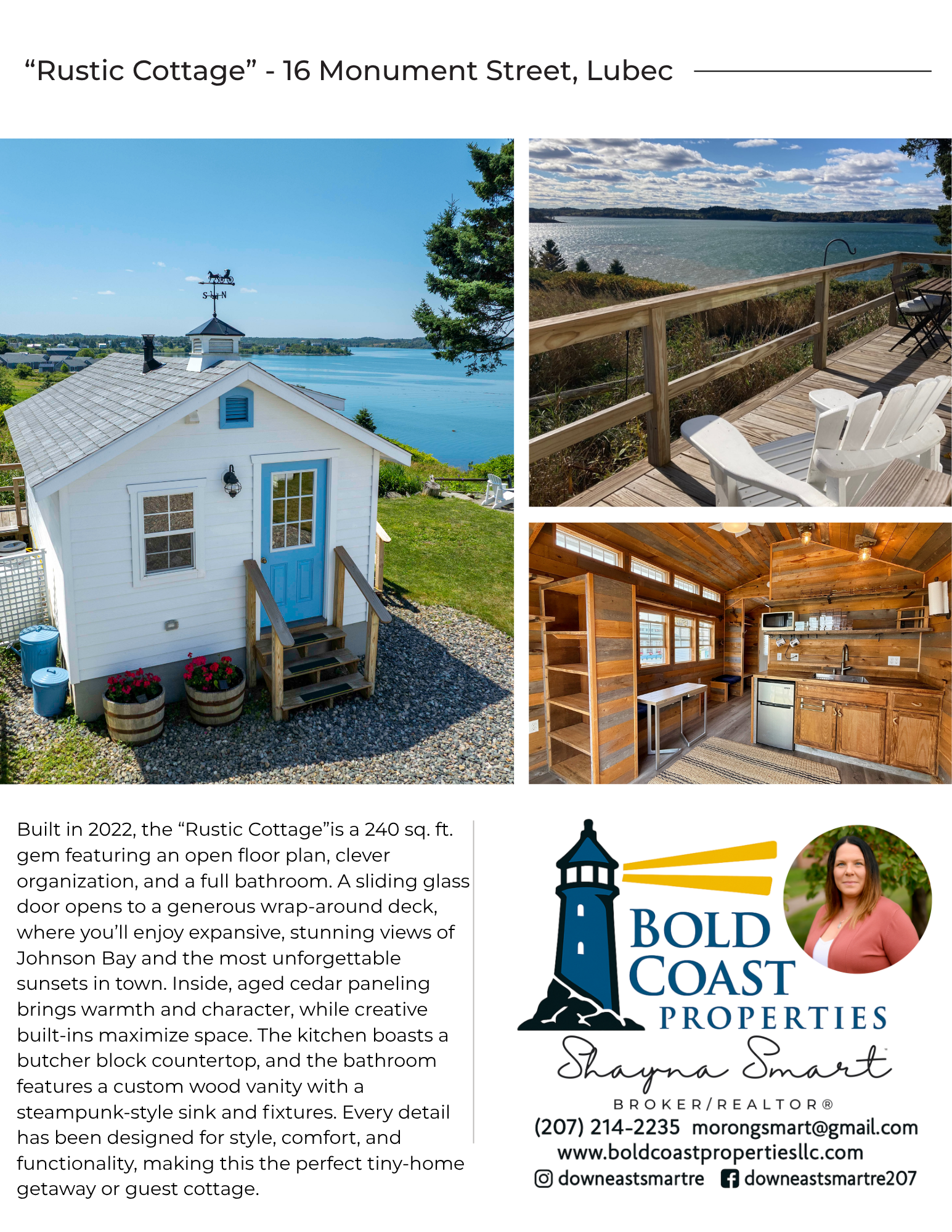 THE SEAL HOUSE COMPOUND - Sweeping Johnson Bay views and the BEST sunsets in town define this rare in-town offering on a quiet side street with a white picket fence. Two Amish-built, year-round tiny cottages are perfectly sited to take in the water and wildlife, with wrap-around decks, Adirondack seating, and a boulder fire pit - an effortless indoor-outdoor coastal lifestyle within walking distance to downtown, the grocery, bank, beaches, and trails. The 2021 'Luxury Cottage' delivers 240'+/- sq of designer efficiency with an open plan, custom kitchen outfitted with Big Chill Retro appliances, clever built-ins and a Murphy bed, plus a spa-inspired bath with custom shower and California Closet storage; its panoramic deck stages nightly, color-washed skies. The 2022 'Rustic Cottage,' also 240'+/-sq, charms with an airy open plan, sliding glass door to its own wrap-around deck, warm aged-cedar interior, smart built-ins, butcher-block kitchenette, and a full bath with a custom wood vanity and steampunk-style fixtures. Where the vision started & complementing the cottages, the c.1920 main house by craftsman John Trecartin offers 1,347'+/- sq with 3 bedrooms and 1 bath, bay views from many rooms, and lovely original charm maintained with thoughtful updates- an inviting base while guests enjoy the cottages. Together the three dwellings provide 5 bedrooms, 3 baths, and 3 kitchens - ideal for a multi-generational retreat, guest overflow, or vacation/short-term rentals. ***MLS details reflect totals for all three living spaces.***